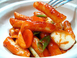 Popular Korean snack made of soft rice cake and sweet red chili sauce