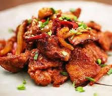 Thinly sliced pork marinated in a spicy chili pepper sauce